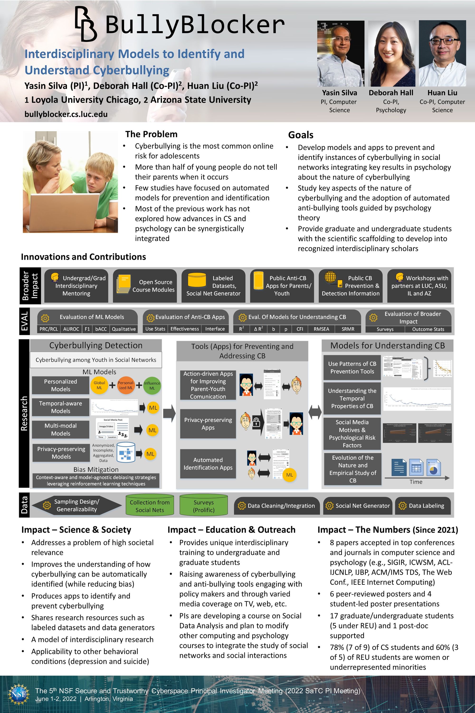 The NSF grant “SaTC: Core: Interdisciplinary Models to Identify and Understand Cyberbullying” (Award No. 2227488, $390,421.00, Jan. 2022 – Dec. 2024), recently transferred to Loyola, will support the research activities of the BullyBlocker project (part of the Data Lab) at LUC. Dr. Yas Silva leads this project and collaborates with colleagues at Arizona State University and the Federal University of Uberlândia (Brazil).